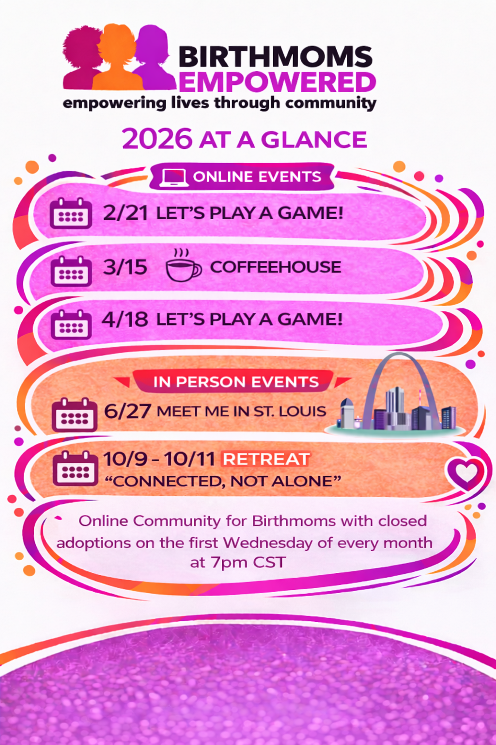 We’re excited about what’s coming in 2026. We’ll be hosting five events—three online and two in person—focused on connection, conversation, and fun! We also host a monthly closed adoption Birthmom call on the first Wednesday of every month at 7pm CT. If you want updates or more details about our events and calls, you can sign up for more info here.